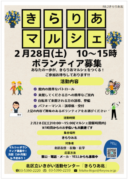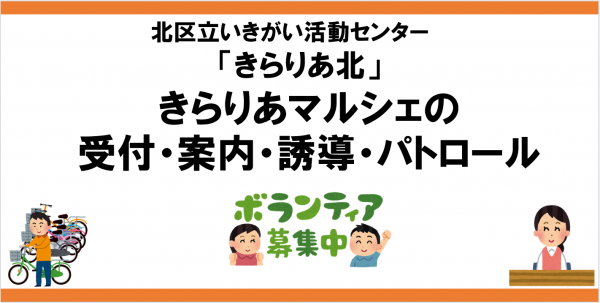 2/28(土)10:00~15:00 きらりあマルシェが開催されます。そこで、ボランティアさんをして下さる方を募集しています。