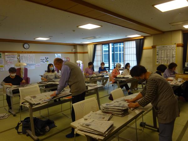ウエス作り、チラシの箱作りのお手伝いお願いいたします。ボランティアに参加される皆さまと楽しくお話しながらの作業です。