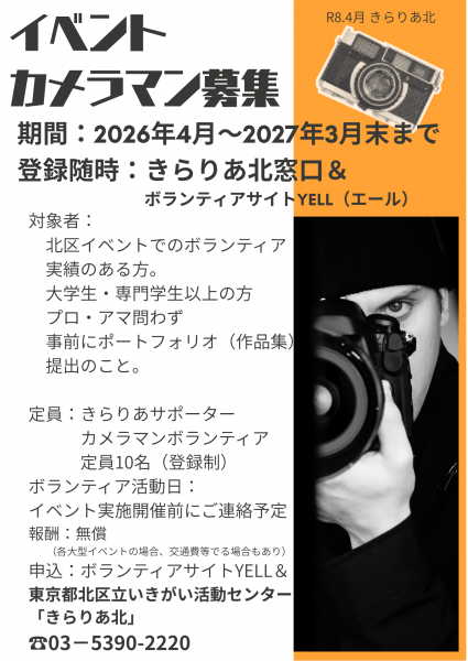 イベントカメラマン募集【北区立いきがい活動センター「きらりあ北」他で活躍予定】