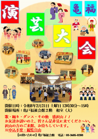 こんにちは!亀戸福祉会館では演芸大会を開催します♪
