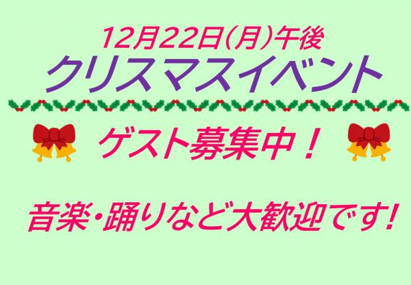 12月22日(月)午後、『クリスマスイベント』を開催します。当日、音楽や踊りで盛り上げてくださるゲストを募集しております。