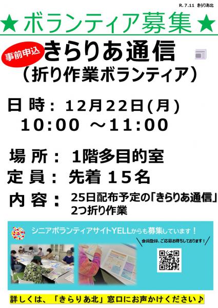 【きらりあ通信1月号折り作業をお手伝いして下さるボランティアさんを募集しています‼】