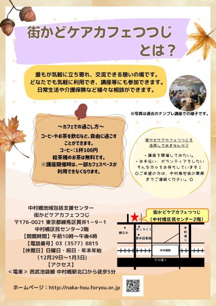 場所:街かどケアカフェつつじ(練馬区貫井1-9-1 中村橋区民センター2階 ※西武池袋線 中村橋駅北口から徒歩5分)